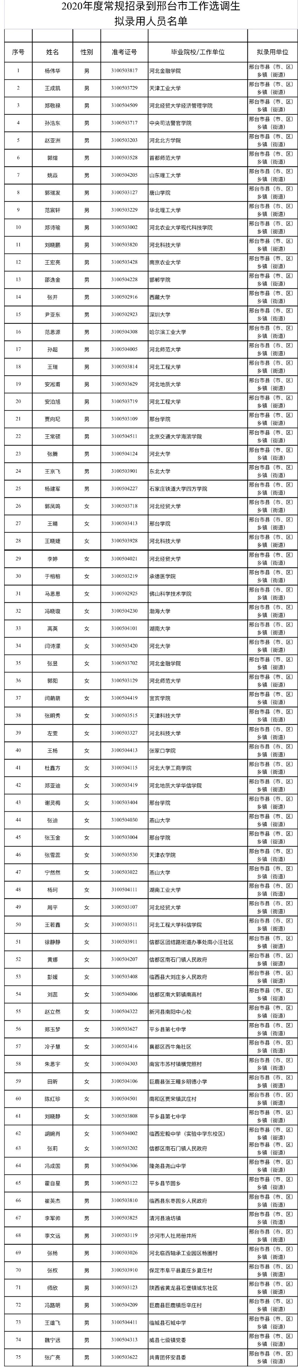 根据河北省2020年面向普通高校应届毕业生和服务基层项目人员选拔选调生工作方案和有关规定,经过报名、资格审核、笔试、面试、体检、考察等程序,受省委组织部委托,经研究,确定杨伟华等75人为2020年度常规招录到邢台市工作选调生拟录用人员,现予以公示(名单附后)。