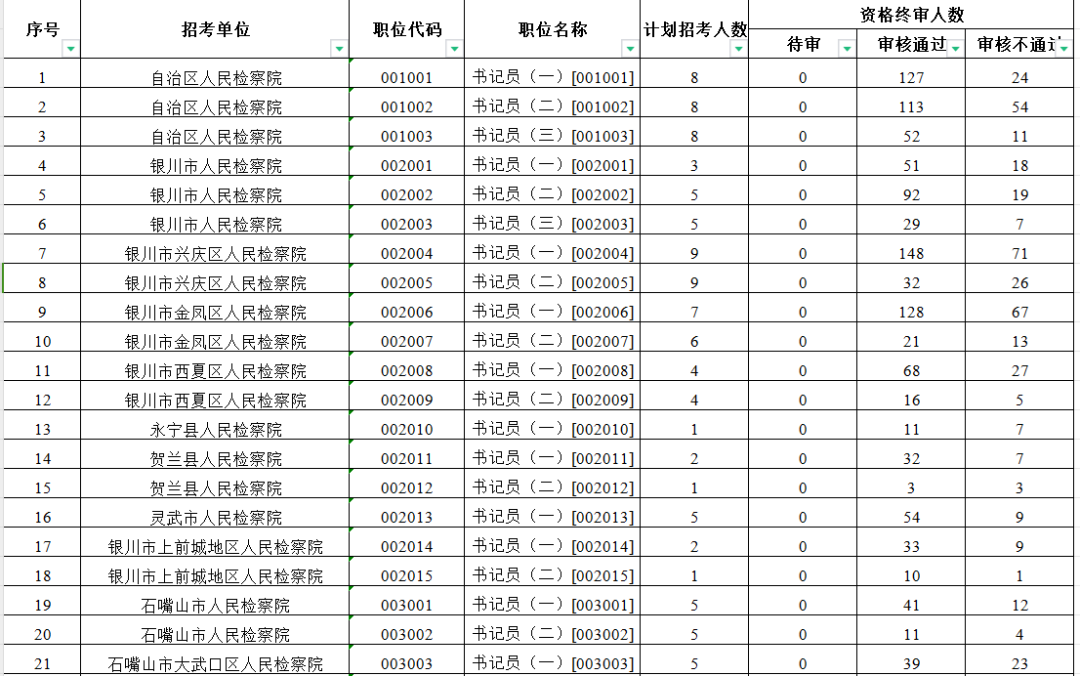 截止2023年9月18日18时,宁夏回族自治区检察系统2023年公开招聘聘用制书记员报名及审核情况如下: