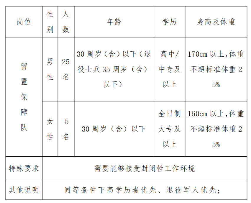 6、同等条件下,优先招聘烈士和因公牺牲人民警察的配偶、子女,具有公安工作需要的特殊专业技能人员或有公安工作经历人员,条件可适当放宽。